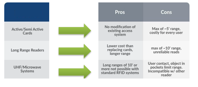 En otros casos, el rango de lectura necesario excede lo que pueden proporcionar los formatos RFID estándar. Cuando la distancia deseada supera los 3 m o más, es común la sustitución de 125 kHz o 13,56 MHz con credenciales y lectores de larga distancia con tecnología (UHF) o basados en microondas.