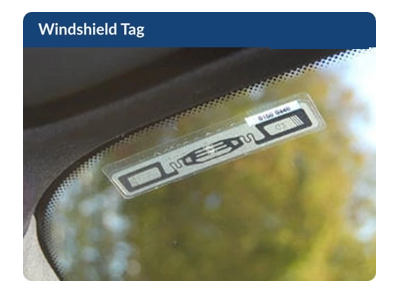 Para la mayoría de los usuarios de acceso, normalmente se llevan las credenciales mediante una tarjeta o llavero, pero para los vehículos, se instala una etiqueta de credencial similar en el cristal del parabrisas para la operación de manos libres.